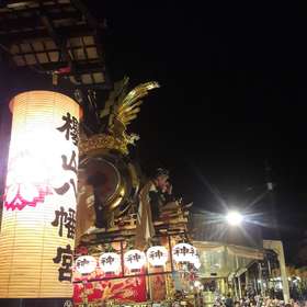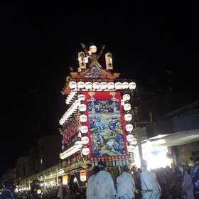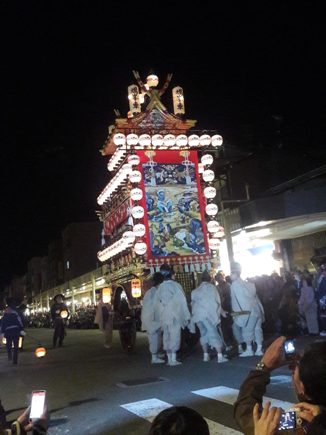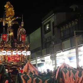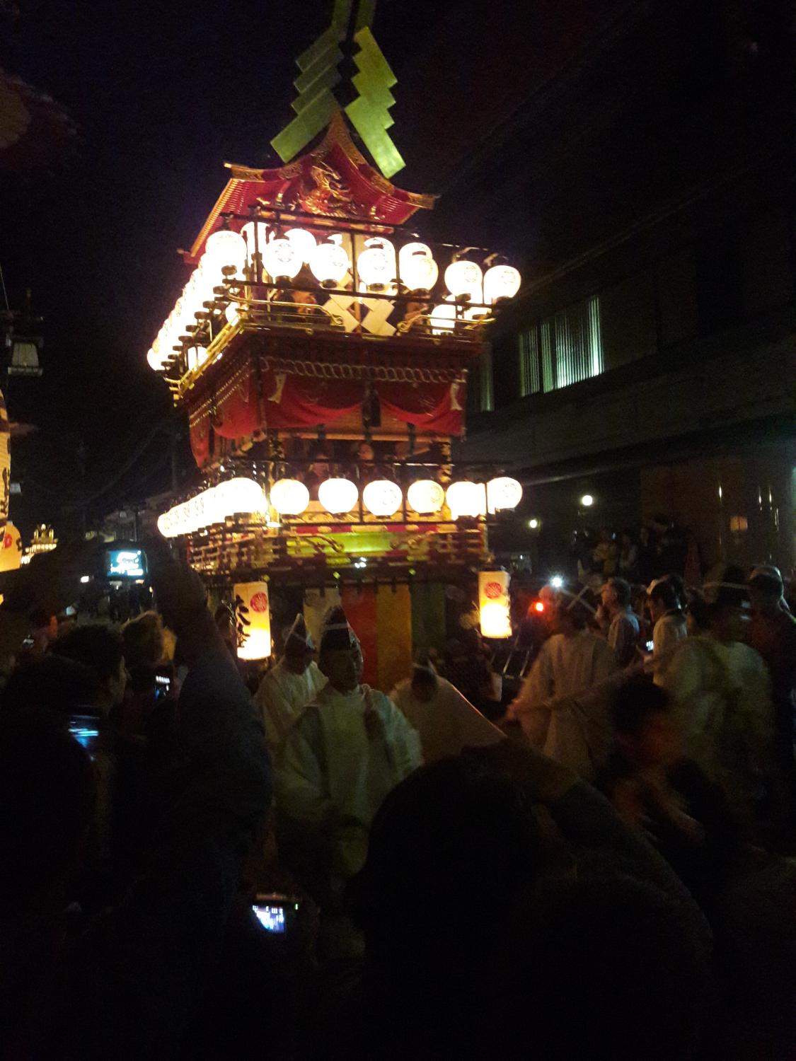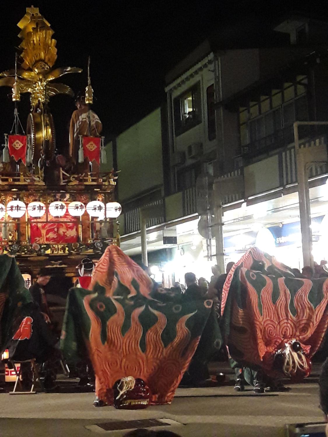 En fin d’après-midi nous sommes allés voir le cortège de nuit des mikoshis de la ville, qui en fait ont un nom différent qu’ils nous faudrait retrouver. Il ne s’agit effectivement pas de temples « portables » puisqu’ils sont tellement imposants qu’ils ressemblent plutôt à des chars, d’ailleurs tirés et manipulés par une douzaine de personnes chacun. D’autres y sont perchés, qui jouent de la flûte et du gong, au rythme desquels dansent plusieurs duos de marionnettistes qui semblent mimer des sortes de démons. Si on a bien compris, le festival (o-matsuri) est le moment de porter Dieu, qui réside habituellement au temple, à travers les rues de la ville pour en chasser les mauvais esprits.