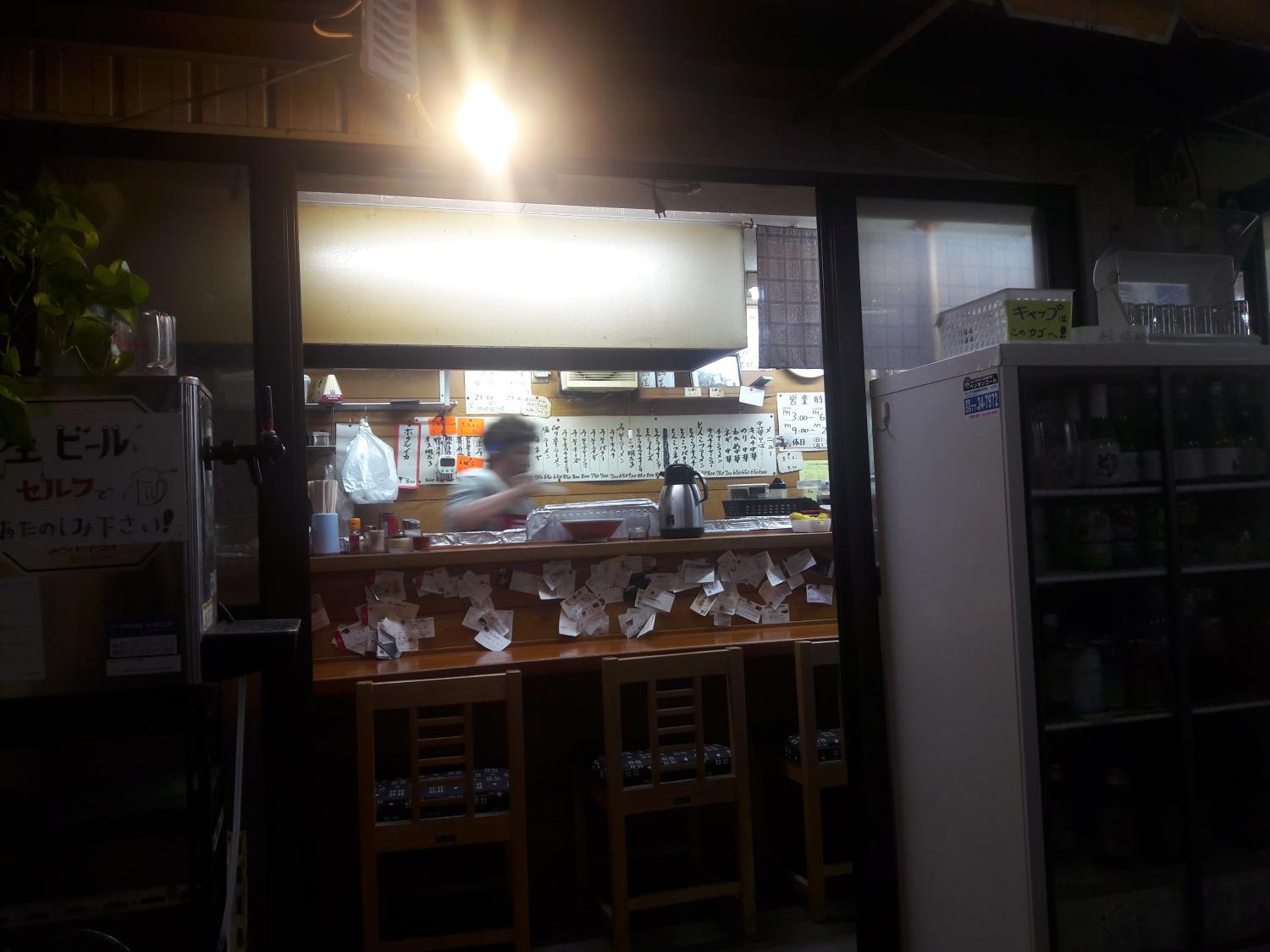 Et enfin comme toute soirée japonaise finit tôt, ici 21h, nous avons cherché un restau pour finir la soirée. Selon l’adage, confirmé par Janie, « the dirtier the place, the better the taste », soit « plus c’est crado et meilleur c’est ». On a donc choisi un boui-boui qui pourrait être l’illustration de référence pour « ne pas payer de mine », avec juste la tenante adorable, et les ramens étaient très bons !